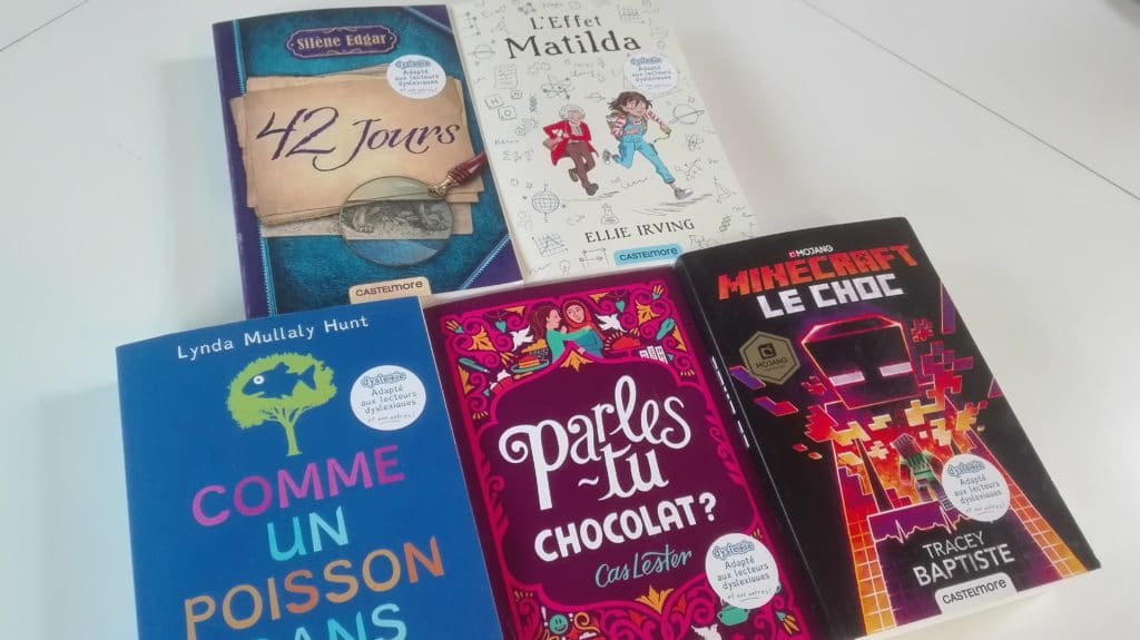 Offerts par l’APEL (Association de parents d’élèves de l’enseignement libre) de Sainte-Geneviève, ces livres ont été entièrement étudiés pour faciliter la lecture. Cela passe par l’objet lui-même qui utilise un format spécifique et sélectionne un type de papier adapté. Ensuite, la mise en page du livre a été améliorée : une police spéciale remplace les polices habituelles, les alignements sont repensés et le texte agrandi pour être plus lisible. Un travail important est fait sur les retours à la ligne et la ponctuation. Les phrases sont plus courtes, sans que le texte soit dénaturé.